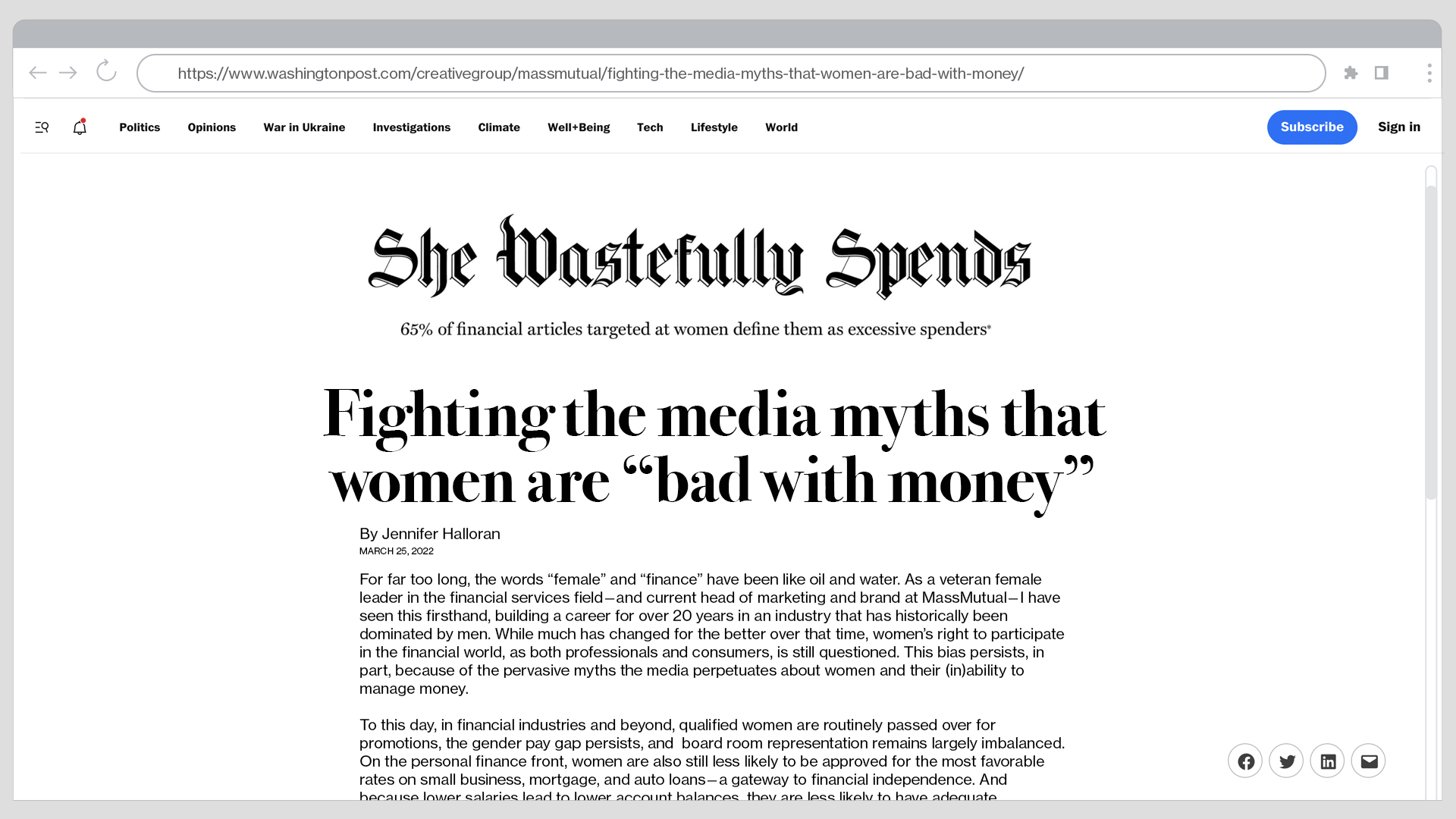 Studies reveal that 65% of financial articles aimed at women label them as "excessive spenders," leading to negative societal perceptions and tangible consequences. Mass Mutual partnered with The Washington Post to to expose these incorrect categorizations, using their logo’s as a platform to expose the mistakes media usually publishes about women, challenging the industry to do rethink their wrong perceptions.